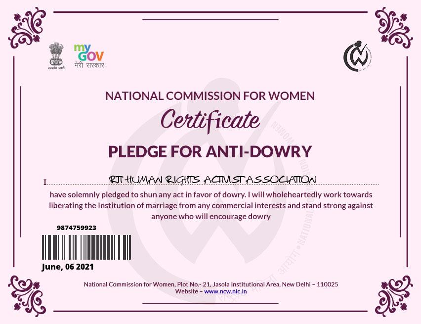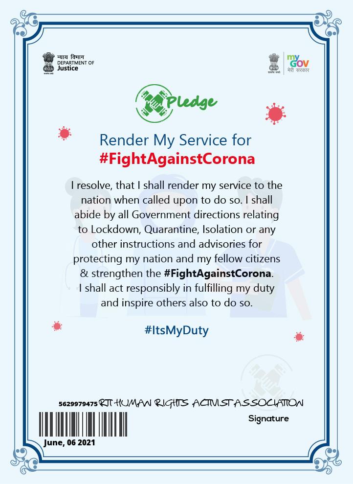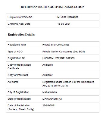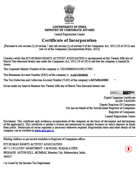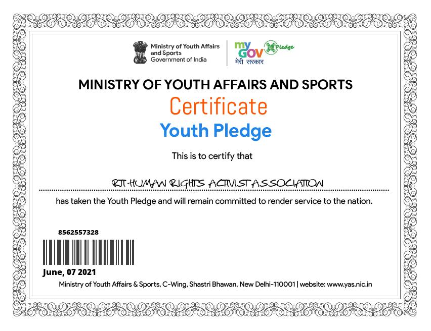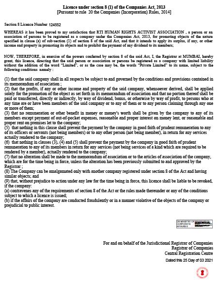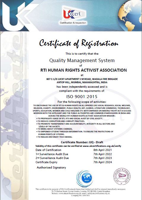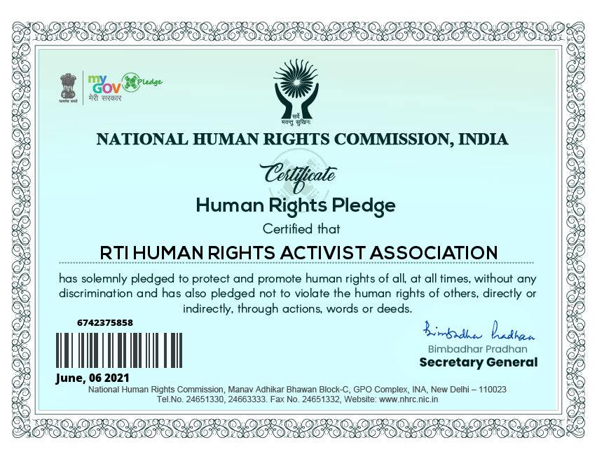 RTI Human Rights Activist Association is an ISO Certified Legal Aid & Social Service providing organization registered under MCA Govt. Of India and NITI Aayog Govt. Of India, MSME & ISO 9001 : 2015 CERTIFIED, N.C.T and also accredited with UNO with the sole purpose of legal empowerment and access to justice for everyone.